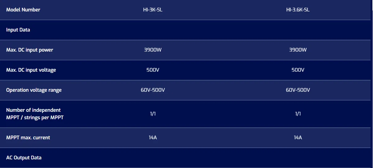 Thông số kỹ thuật chi tiết của Inverter On-grid Inhenergy 3KW SI-3K-S2 được liệt kê trong bảng sau: