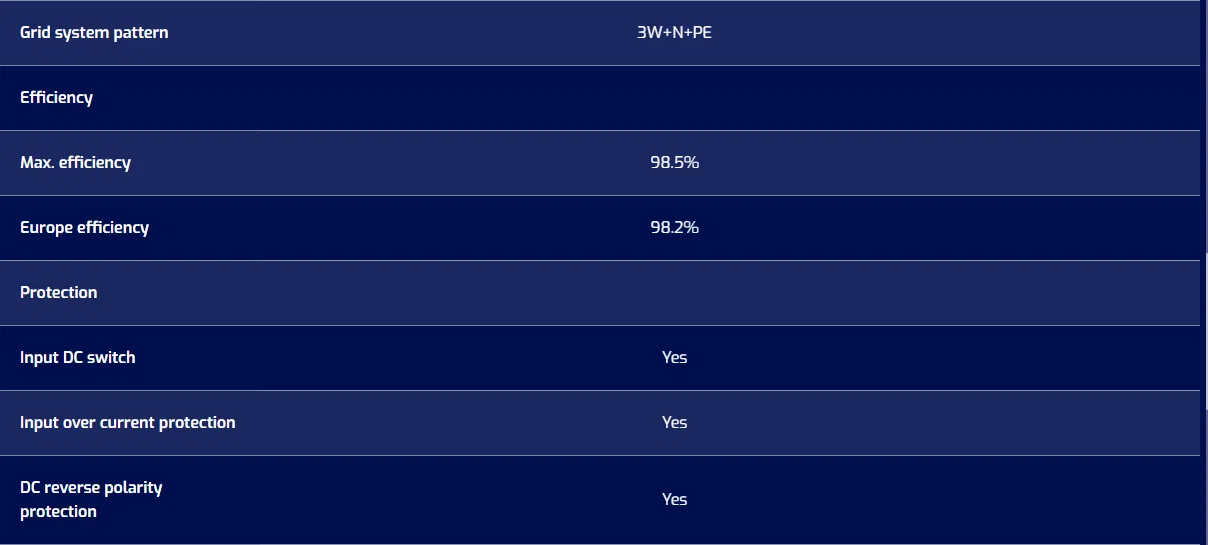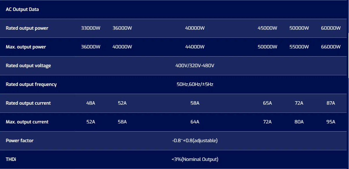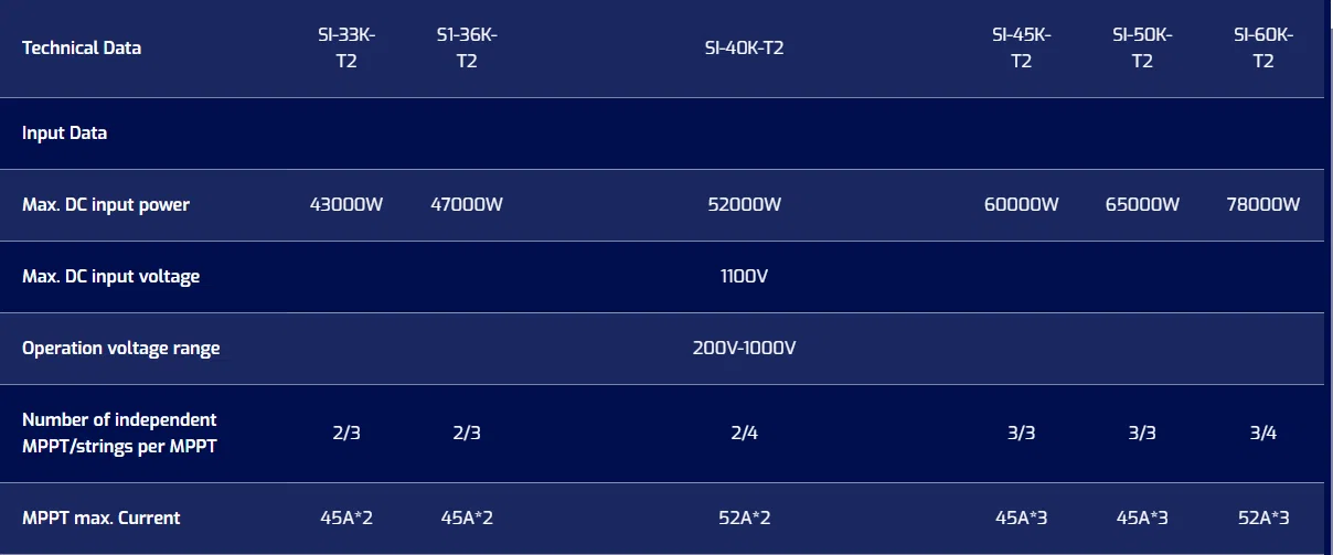 Thông số kỹ thuật chi tiết của Inverter On-grid Inhenergy 50KW SI-50K-T2 được liệt kê trong bảng sau: